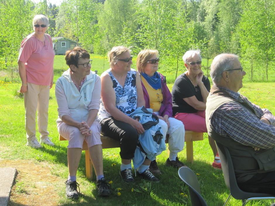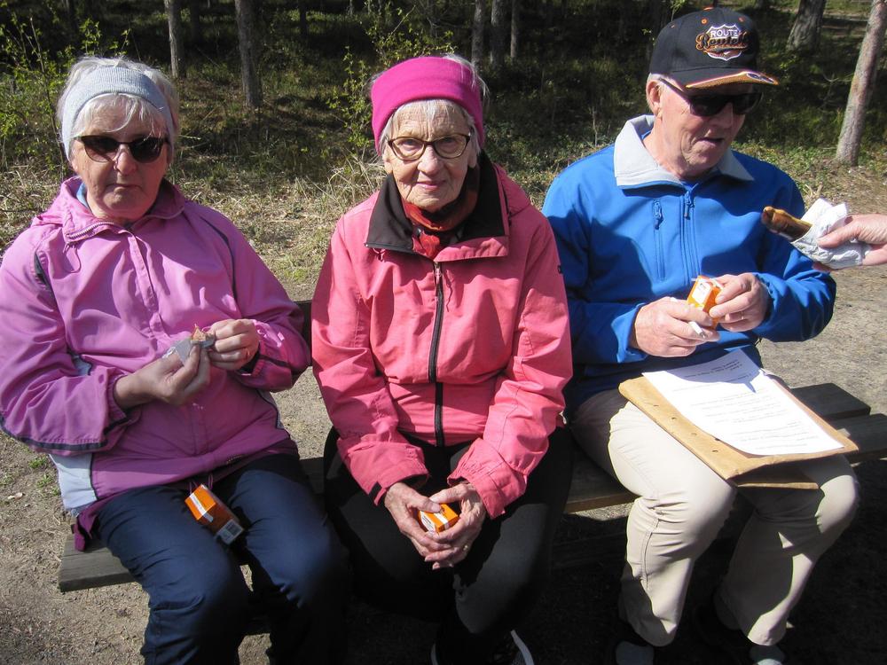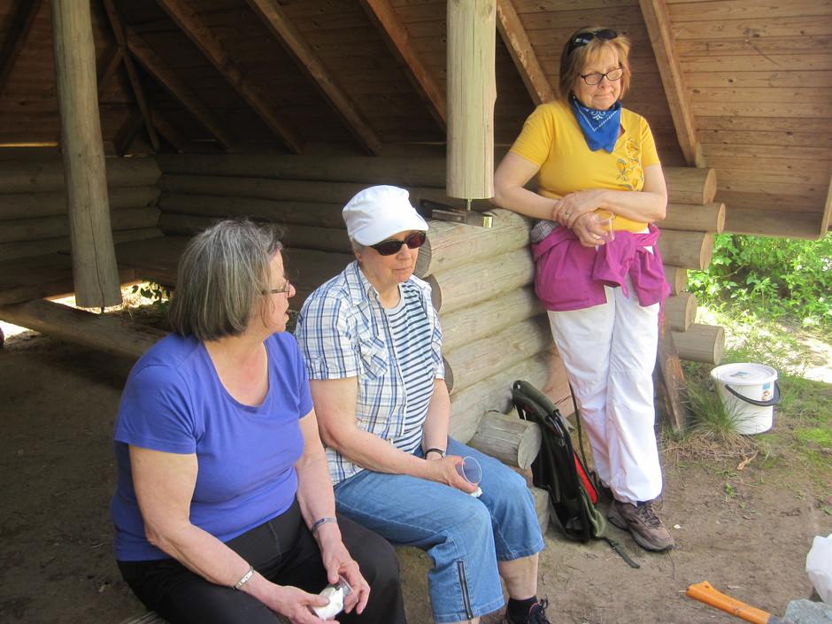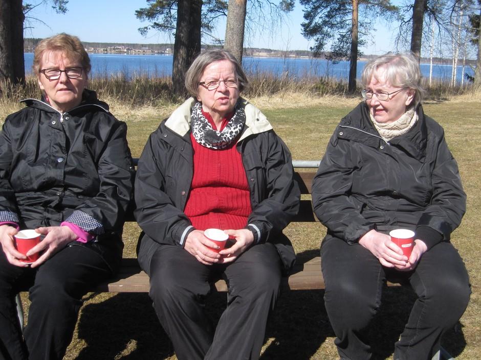 Ritva, Kyllikki ja Aila kevätauringossa kaunis järvi taustalla. 2017